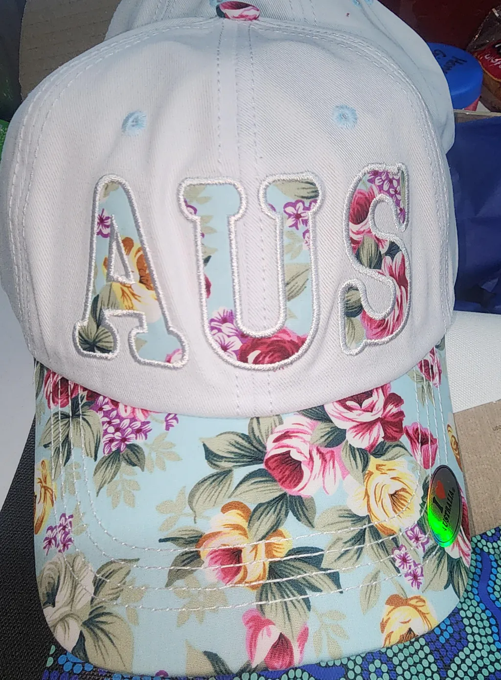 The letters "AUS" are prominently displayed across the front in a textured, almost patchwork style, with each letter showcasing the same floral pattern. This bold, yet elegant design element makes the cap a standout piece. The floral pattern continues on the brim, seamlessly connecting the front and top designs.